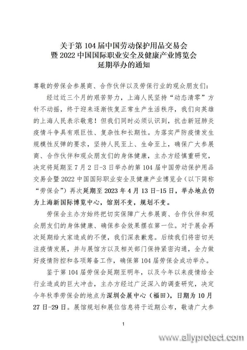 經(jīng)過近三個月的艱苦努力,上海人民堅持“動態(tài)清零”方針不動搖,終于迎來逐漸恢復(fù)正常生產(chǎn)生活秩序,我們向英雄的上海人民表示敬意!但我們同時必須認(rèn)識到,抗擊新冠肺炎疫情斗爭具有艱巨性、復(fù)雜性和長期性。為落實嚴(yán)防疫情發(fā)生規(guī)模性反彈的要求,堅持人民至上、生命至上,確保廣大參展商、合作伙伴和觀眾朋友們的身體健康,主辦方經(jīng)慎重研究,決定將延期至7月2日-3日舉辦的第104屆中國勞動保護用品交易會暨2022中國國際職業(yè)安全及健康產(chǎn)業(yè)博覽會(以下簡稱“勞保會”)再次延期至2023年4月13日-15日,舉辦地點仍為上海新國際博覽中心,館別不變,規(guī)劃不變。